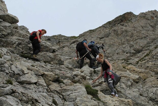 Ausrüstung: Komplette Klettersteigausrüstung und Helm.