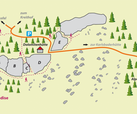 Knapp neben einem Felsabbruch in 1.600 Metern Höhe, mitten in den Lienzer Dolomiten, klammert sich die gleichnamige Dolomitenhütte an den Berg. Direkt unterhalb der Hütte durchziehen 116 Kletterrouten die südseitig abfallenden Felswände. Vom Ausblick auf die imposanten Dolomitengipfel sollten sich Kletterer nicht allzu sehr ablenken lassen, wenn sie die Route „Another Play in Paradise“ schaffen wollen – zumindest nicht bis zum ersten Rastpunkt. Im oberen Teil mit seinem typischen Hochgebirgskalk folgen technisch anspruchsvolle Passagen, die vorbildlich mit Bohrhaken abgesichert sind.