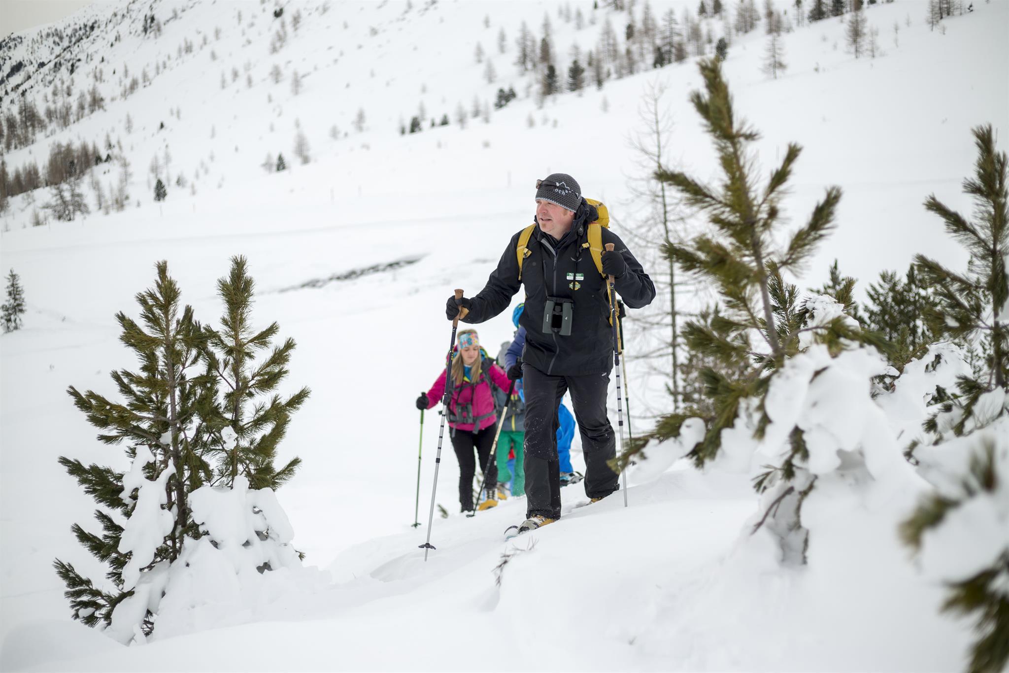 Auf Schneeschuhen ins Reich von Steinbock, Gämse, Adler und Bartgeier. Ausgerüstet mit Spektiven und Ferngläsern stapfen sie gemeinsam durch den Pulverschnee und folgen den Spuren der Wildtiere in den zerklüfteten Tälern des Nationalparks. Gespannt warten die Schneeschuhwanderer, bis der Ranger mit seinem geschulten Auge die Nationalparkbewohner in der verschneiten Winterlandschaft entdeckt und sie gemeinsam durch das Spektiv beobachten kann. Die Nationalpark-Ranger begeistern mit viel Wissen über die heimischen Spezialisten im Tier- und Pflanzenreich, im beeindruckenden ursprünglichen Lebensraum im Hochgebirge.