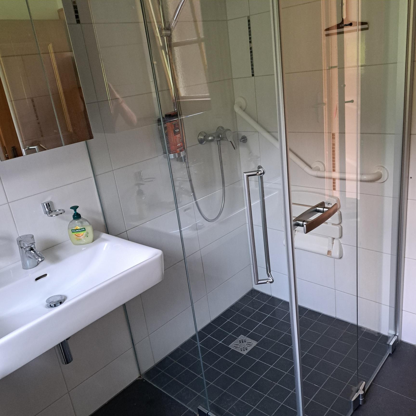 Badezimmer mit Waschbecken, WC, Dusche