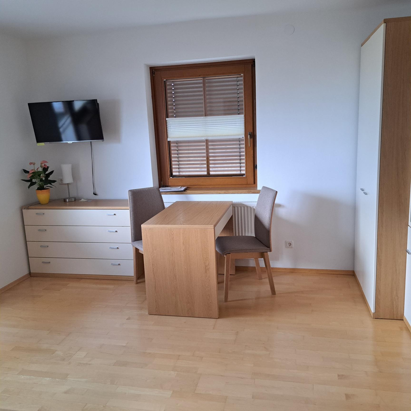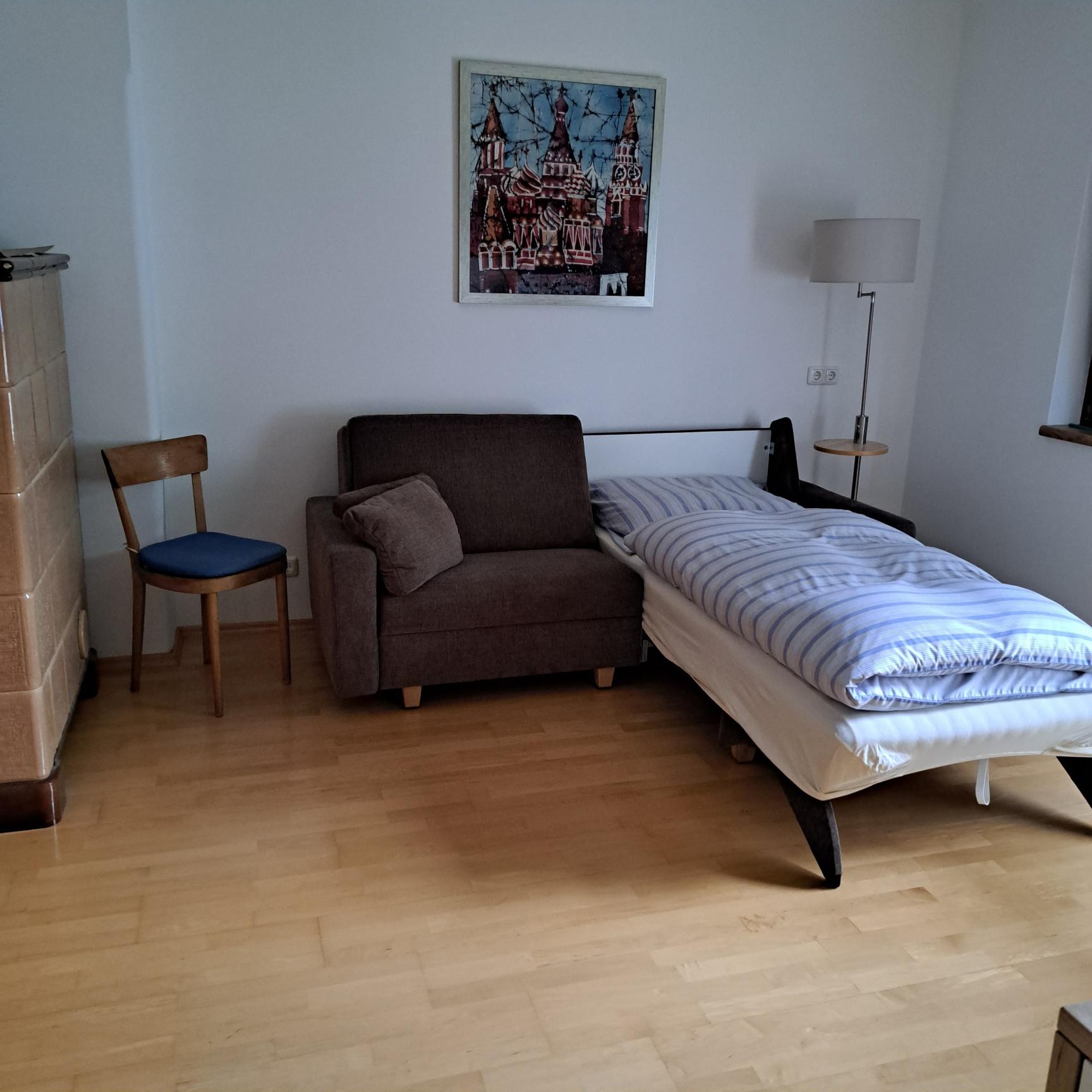 Wohn-/Schlafzimmer mit ausziehbarer Couch, Schreibtisch, Sat-TV