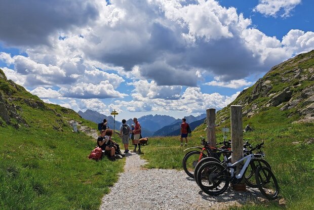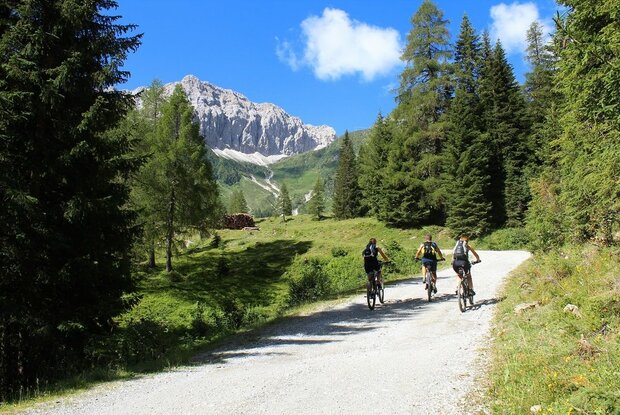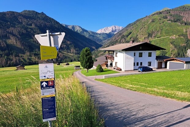 An der Bushaltestelle beim Hotel Weiler führt ein ca. 1 km langer asphaltierter Feldweg hinunter zum Mühlboden. Von dort geht es auf einem Schotterweg leicht ansteigend durch das Dorfertal, wobei flache und etwas steilere Passagen wechseln. Im Pfaffenboden fahren wir an der Weggabelung rechts über die Brücke weiter und gelangen zum Klapfsee. Von dort geht‘s noch in einigen Kehren hinauf zur Porzehütte (1.942 m) bzw. knapp vorher in steileren Serpentinen auf das Tilliacher Joch.