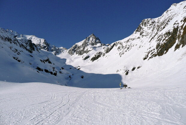 Nach einer Stunde erblicken wir linker Hand die Niljochhütte am Eselsrücken. Das Gelände wird nun flacher und vor uns öffnet sich ein weiter Kessel, der den Namen Großes Niltal trägt. An schönen Almhütten vorbei führt uns der Weg in den Talschluss, wo die Spur wieder in steiles Gelände übergeht. Bei guter Spuranlage lässt sich dieser Hang in einem ausgreifenden Bogen überwinden, bevor wir in östlicher Richtung auf einem Felskamm die Bonn-Matreier Hütte erblicken. Vom Boden unterhalb der Hütte gelangen wir über schönes Muldengelände auf den Felsriegel und erreichen unser Ziel von der Rückseite (Norden), 3 – 3 ½ Stunden vom Auto. Abfahrt entlang der Aufstiegsspur.