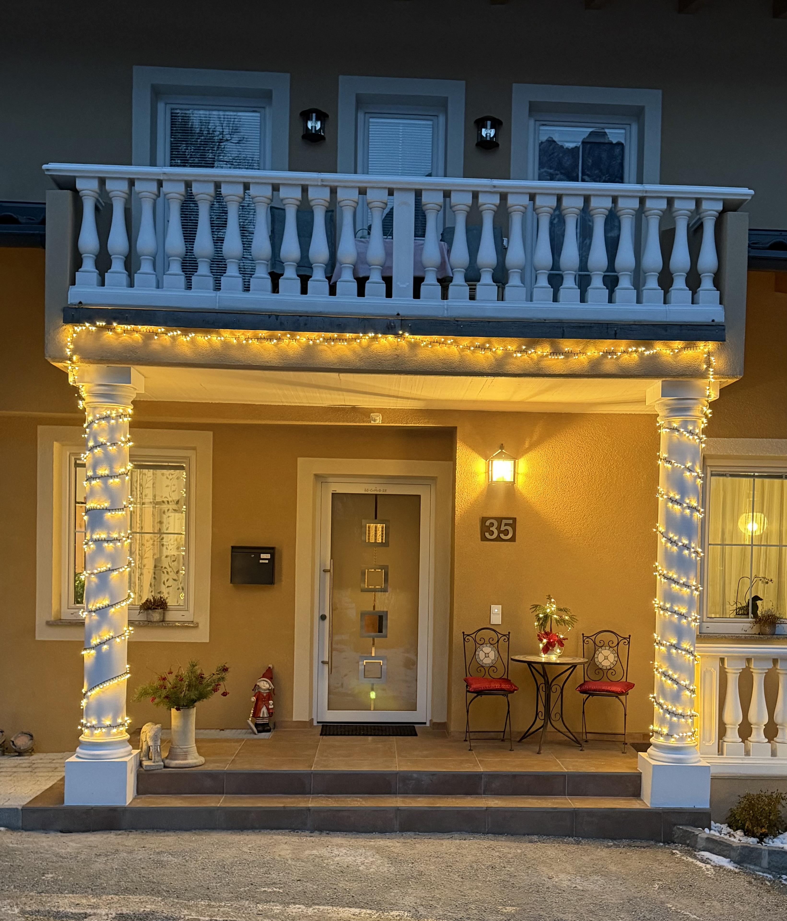 Gleich nach rechts 1. Haus (weiße Balustrade).